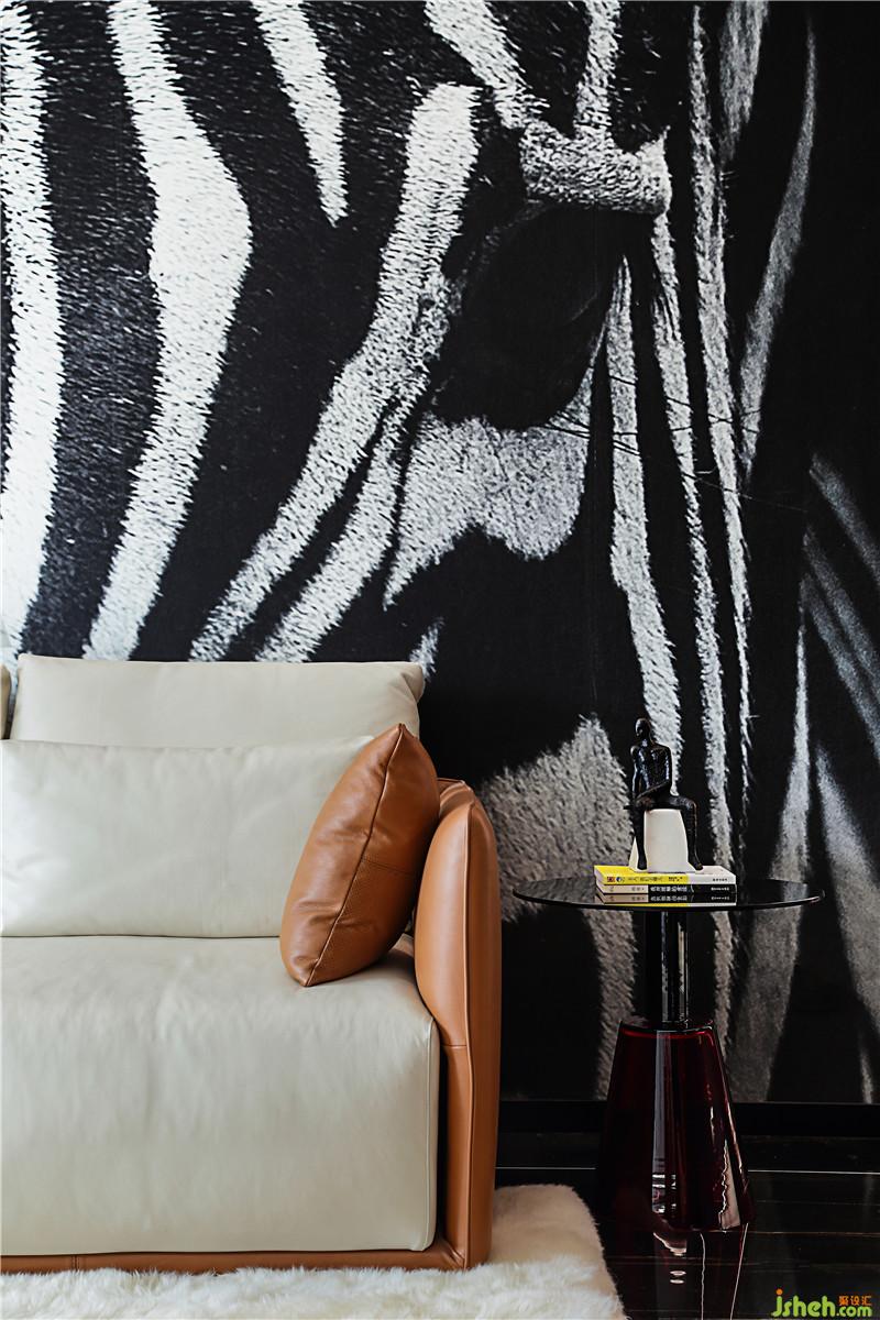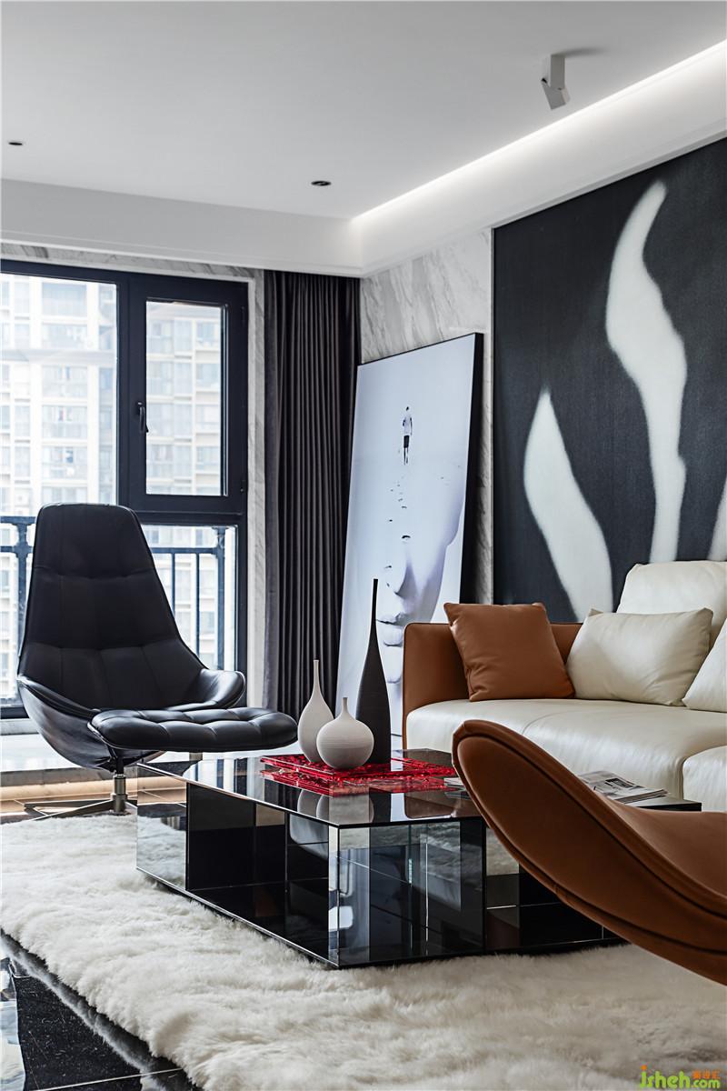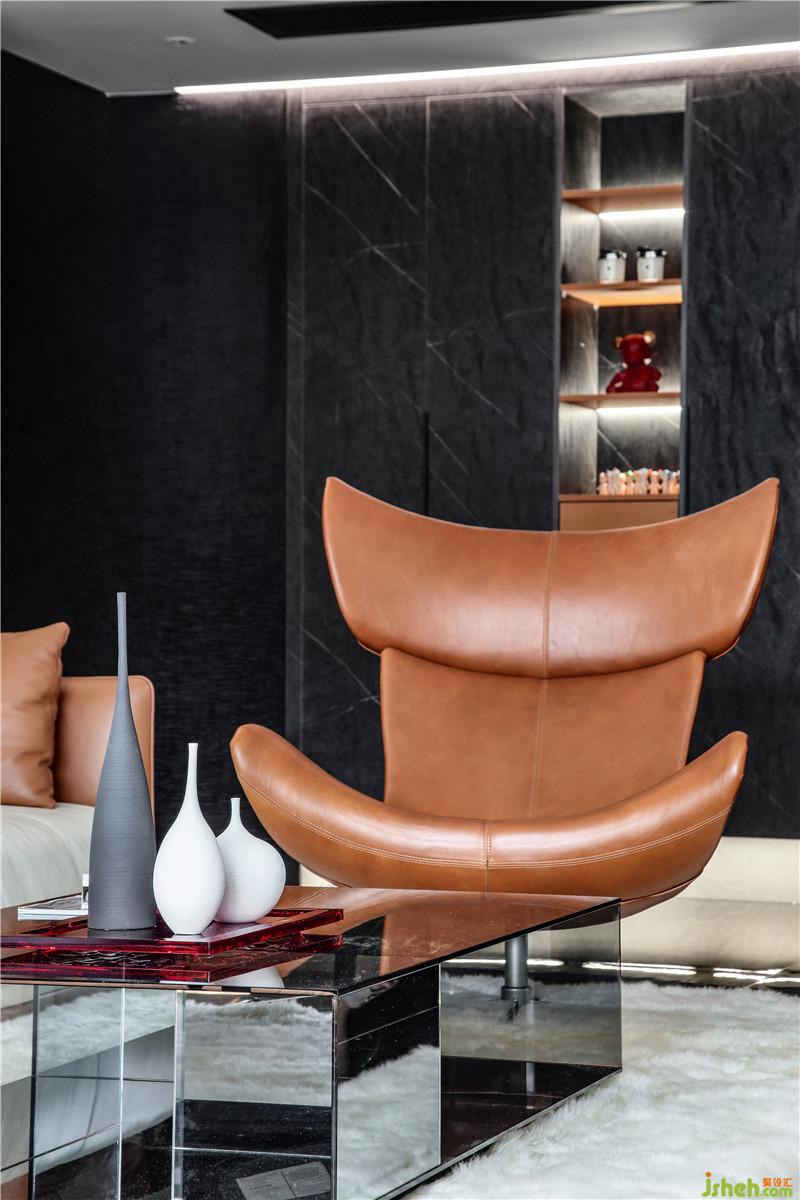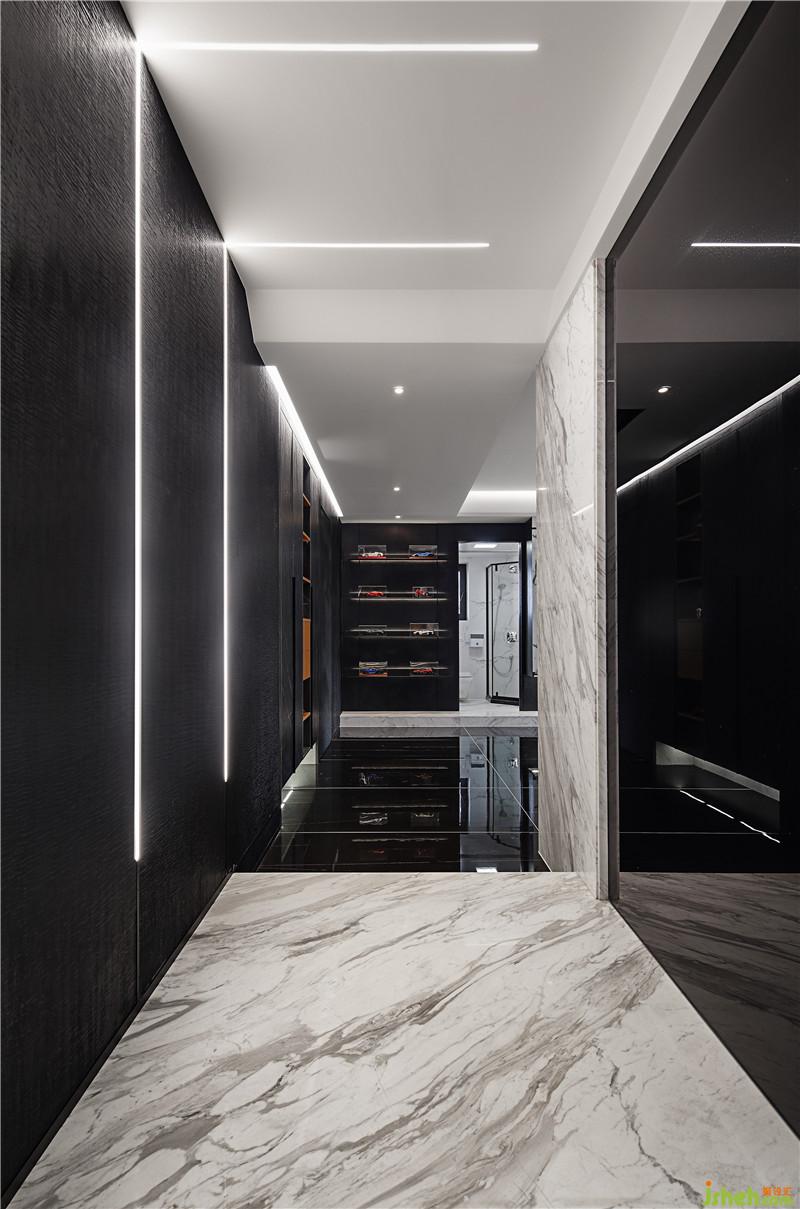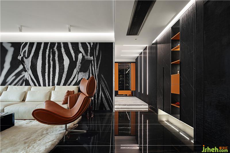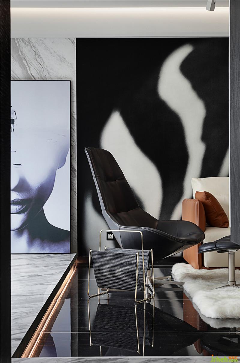 这个角度能够比较完整地看出黑色与白色的配比以及地台层次的呼应衔接关系。地台的灯光也为整个空间增添了氛围。