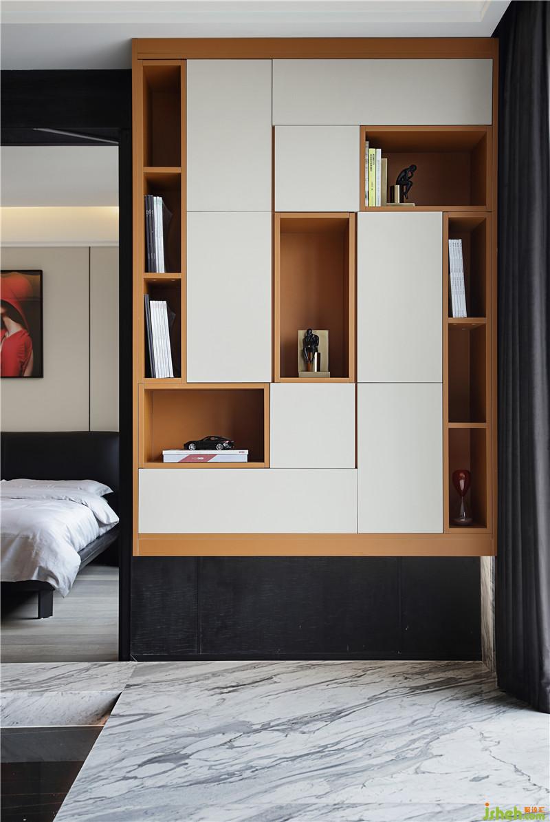 为了色调的空间平衡,我在Imola的对角位置设计了这组与沙发配色相近的装饰书柜,细看的话会发现不少细节,耐人寻味。通过旁边敞开的隐形门隐约能见的是客房。