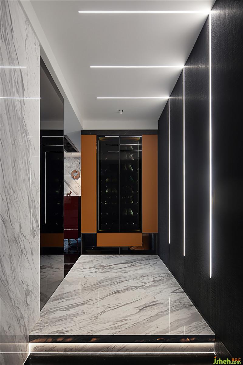 客厅装饰柜我喜欢用悬空加灯光的设计,还是为了空间的视觉变大。中间橙色的装饰柜点亮了这一面墙,色调上也和餐厅空间进行了衔接。