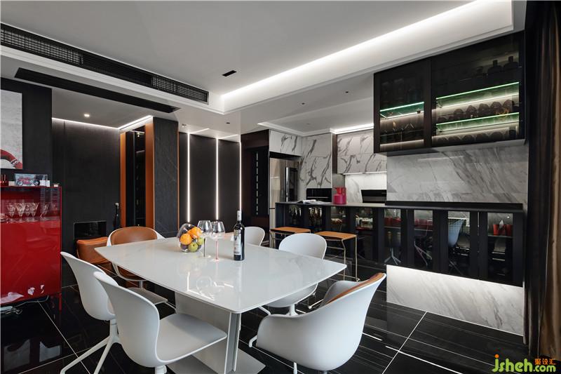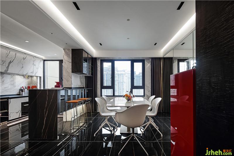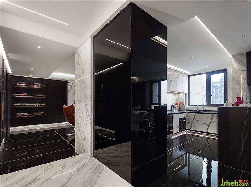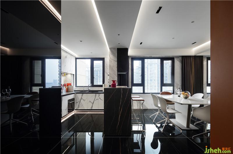 从餐厅进入客厅要跨过爵士白的地台,这一块小小的白色把餐客厅空间区分了开来,高低落差的设计让空间更有层次,更有仪式感。不仅打破了这一片黑色的沉寂,让走道的空间在视觉上被缩短,并且与客厅中的地台遥相呼应。