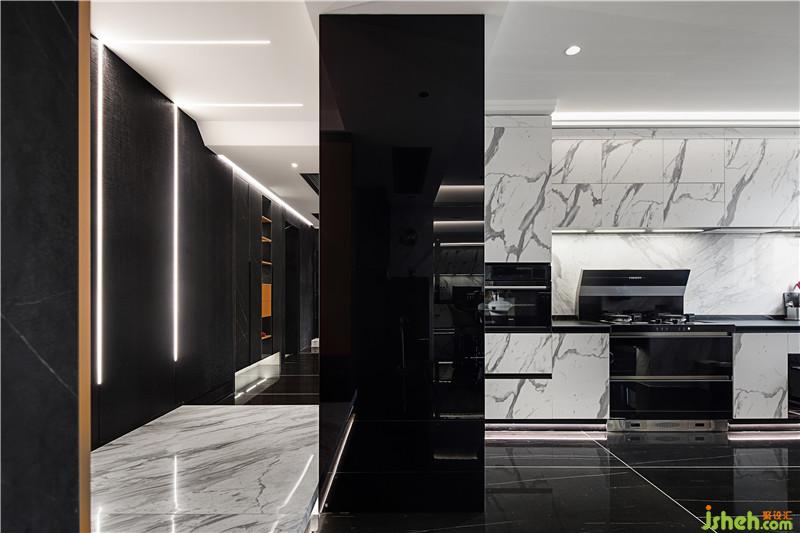 双开门的冰箱被藏在了两片黑色玻璃围成的隔断之中,也算是物尽其用了。仔细看你还会发现,厨房的踢脚线都是带灯光的,而台面则是与地面大板颜色一致哑光肌理的超薄岩板,细节之中高级感无处不在。