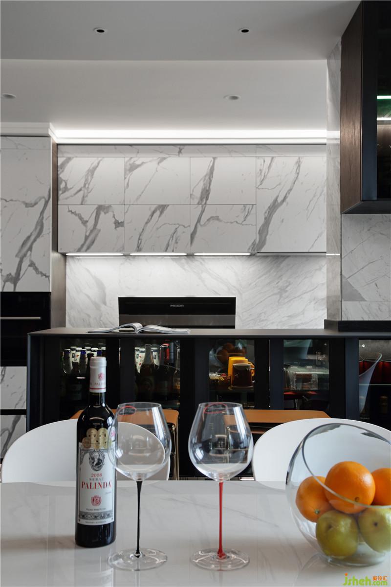 橱柜面板是和墙面大理石相呼应的爵士白肌理,吊柜是百隆的电动上翻。触摸面板,柜门就会自动上翻,并且在集成灶右上方的吊柜里还隐藏着一组电动升降调味篮。做菜的时候放下来,操作完毕再升上去。让台面始终保持整洁,告别凌乱。
