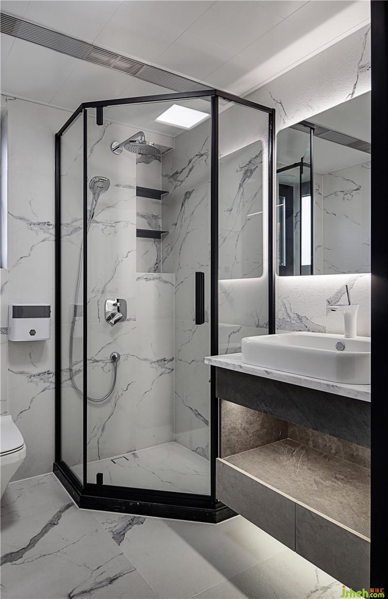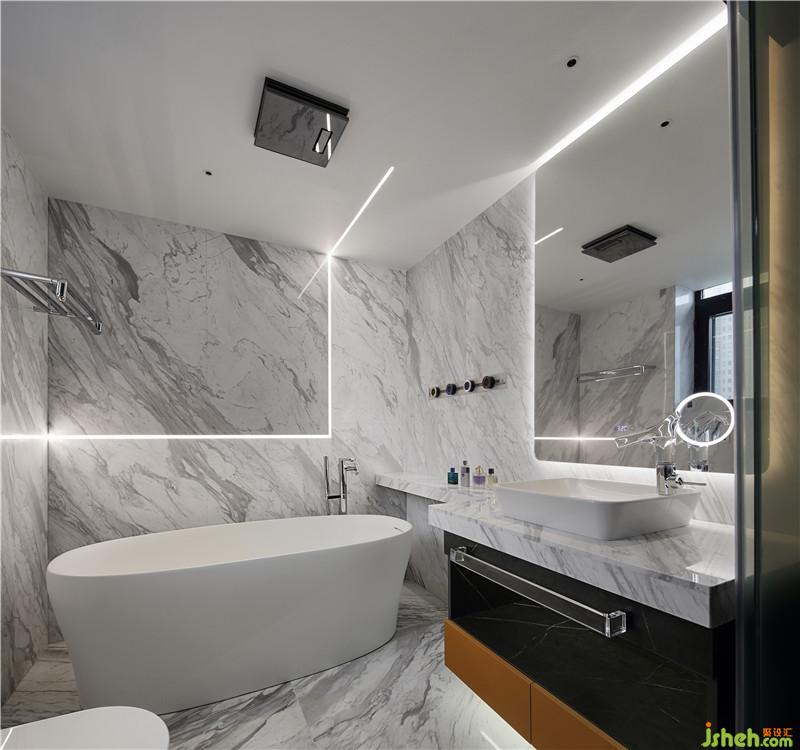 内卫是全爵士白大理石,配合墙面、顶面贯穿的线形灯,简单之中彰显不俗。AXOR的全透明龙头和Kartell By Laufen的透明毛巾杆,虽然透明,却成了最吸引人眼球的地方,让人无法忽略其存在。