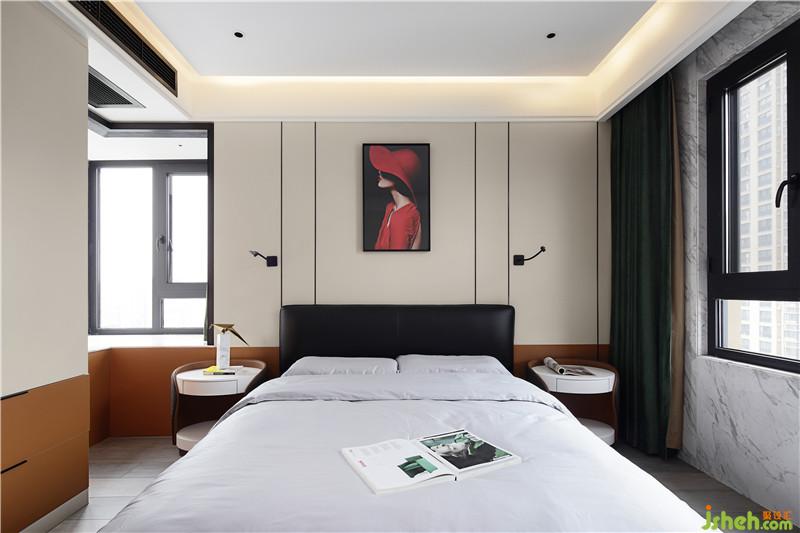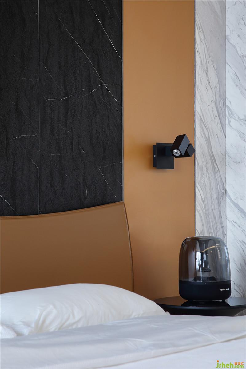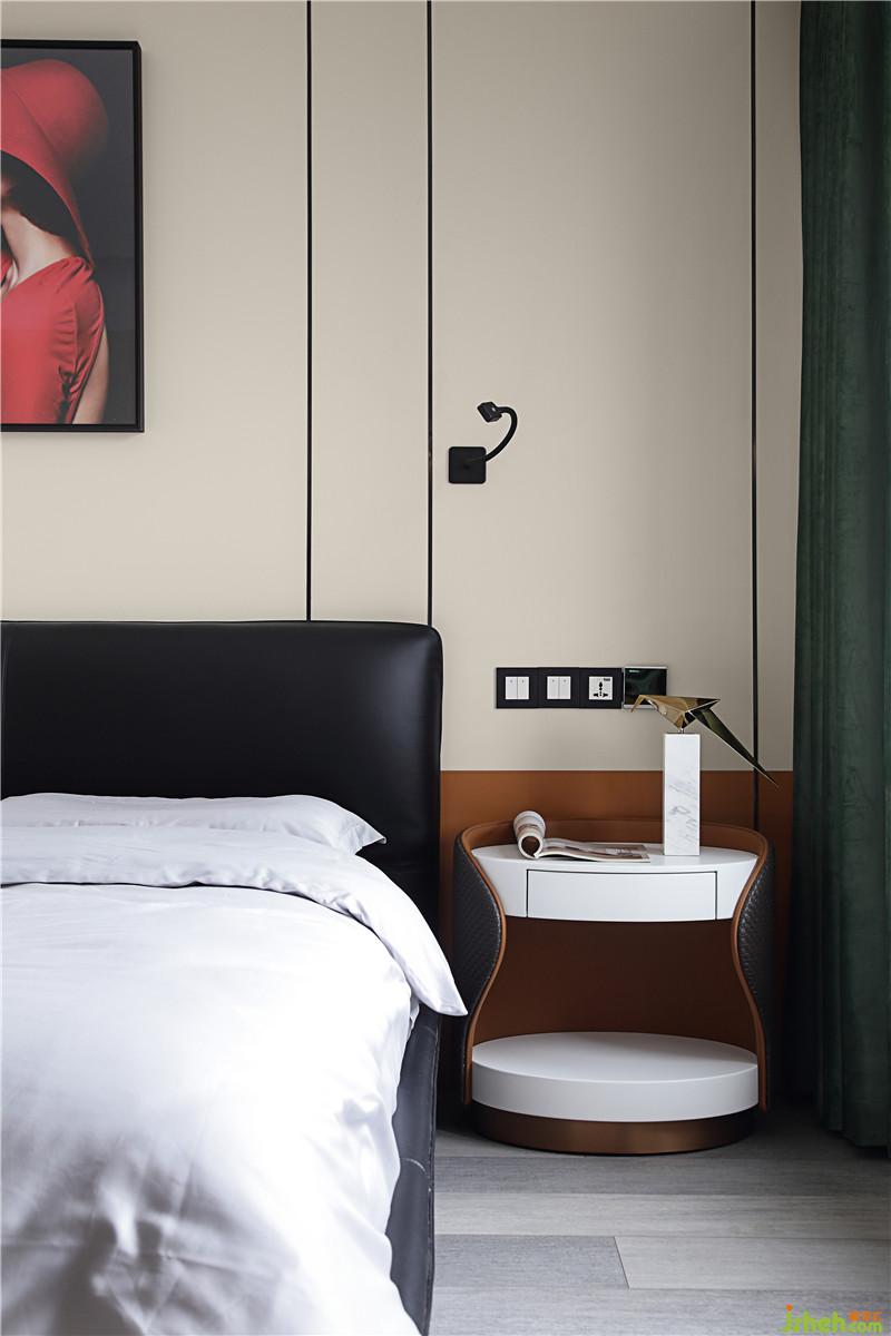 床头可任意调节的阅读灯是非常实用的。Ricci的黑色皮床与Concise Home的床头柜在这个空间里,就像是天生一对。装修公司