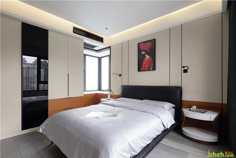 衣帽间的柜子是无侧板支撑的挂墙系统,虽然和传统衣柜只是一块侧板的差别,但是给人带来的惊艳感是很强的。黑与橙的搭配与之前黑白,白橙的搭配形成了色彩的递进。