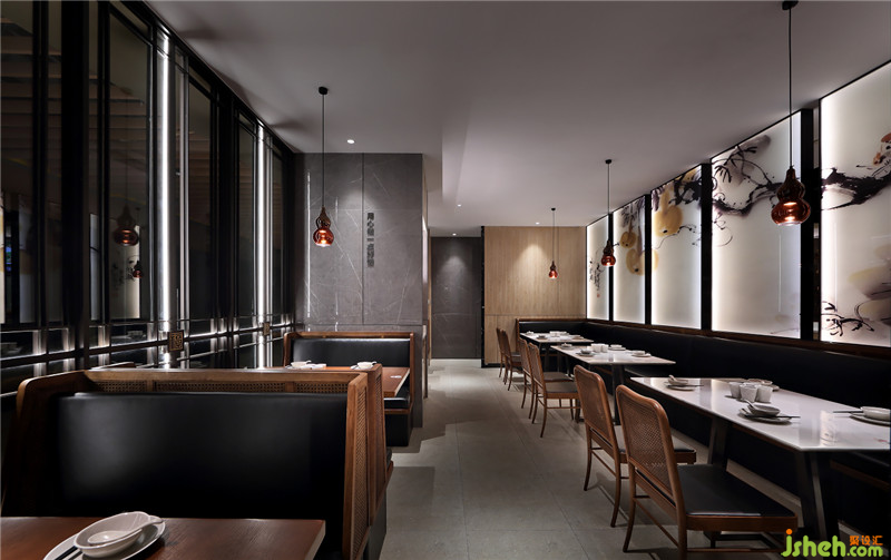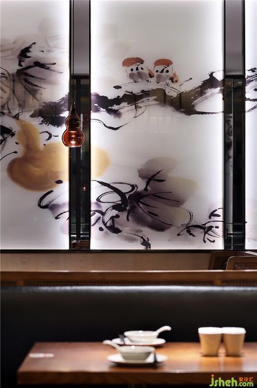 空间开篇的点睛之笔,便是一副墨趣横生的【难得葫图】,枝繁果硕,寓意兴旺美满,将中国人的乐活哲学授予往来食客。门头处巧妙引入本地造化灵秀的山水微景,藏风聚气,将东方的福瑞涵蕴不动声色地延展开去。