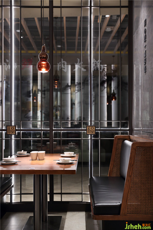 在东方传统的思想中,“葫芦”同“福禄”,是福气的化身。设计师提取百福与葫芦元素,重组当地建筑斗拱符号,从质朴入新的人文情怀着笔,营造一家简约、雅致而带有温度的中餐厅。