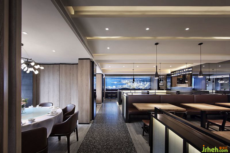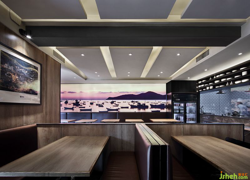 正所谓“千里海岸线,一幅山水画”。本案空间中装饰画皆选用极富威海地域特色的威海景观,彰显威海作为海滨城市的独特魅力。二层放映着威海当地风景照片的软膜灯箱,不仅先“声”夺人,也是自然风景和现代时尚的融合。依靠着木纹墙,欣赏威海自然风景,吃春饼,尝烤鸭,家的温馨感自然流溢。餐厅设计