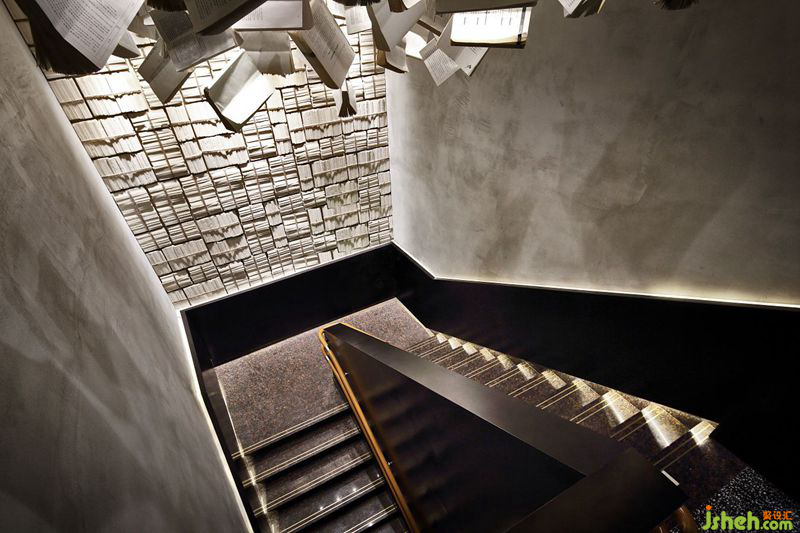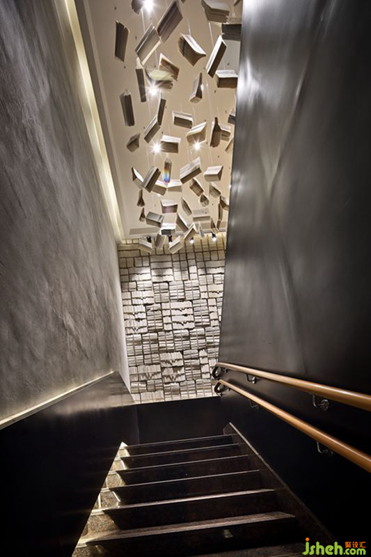 因毗邻山东大学,设计师在空间设计中增添了书籍元素,契合周边大学的书香气息。悬挂在楼梯天花上的书籍装置映入眼帘,一排排陈列的书半开半阖,错落有致,营造出“书海”氛围,给人一种犹如沉浸在知识海洋的梦幻感。