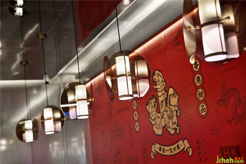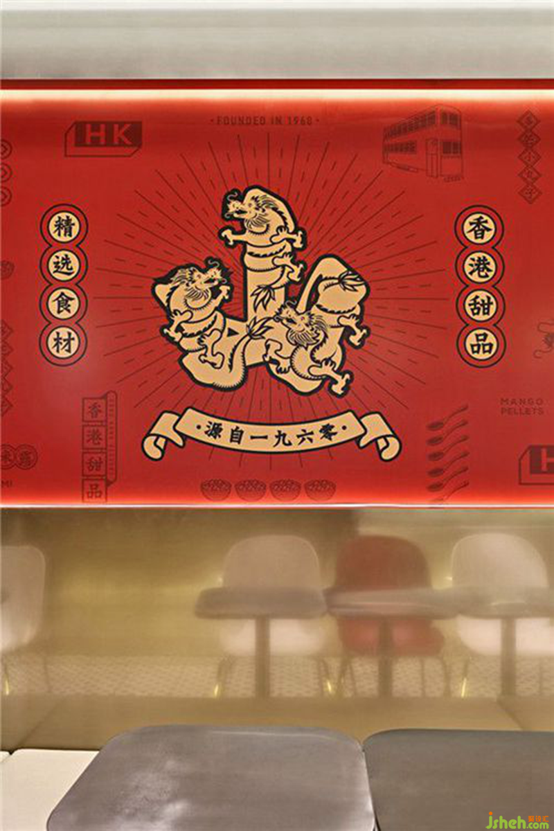 本案设计以传承为依托,运用简洁明快的方式呈现新潮时尚的甜品文化。在许留山的空间演绎上,龙纹和朱砂红的搭配,赋予了空间浓郁的文化气质;