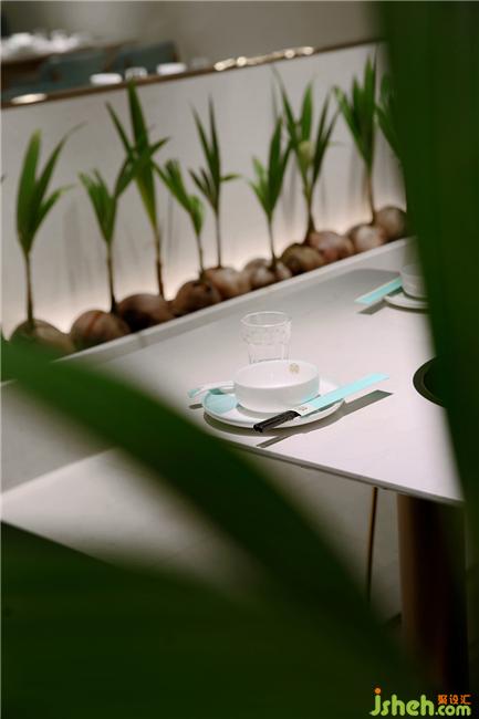 而墙上放大的椰树叶子则寓意食材的“绿色、健康、自然”,这和椰客Slogan追求的“不接受有水分的人生”配合默契。