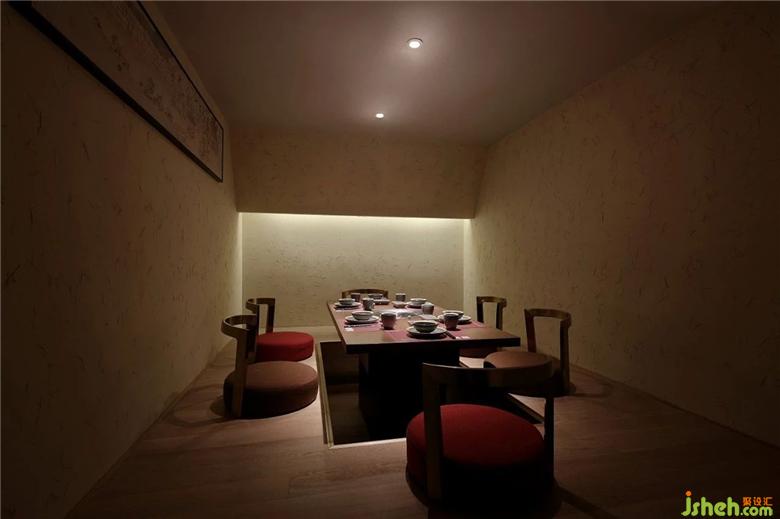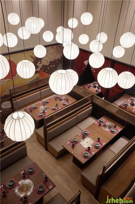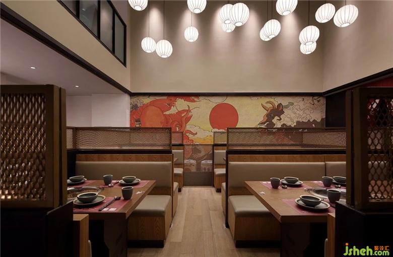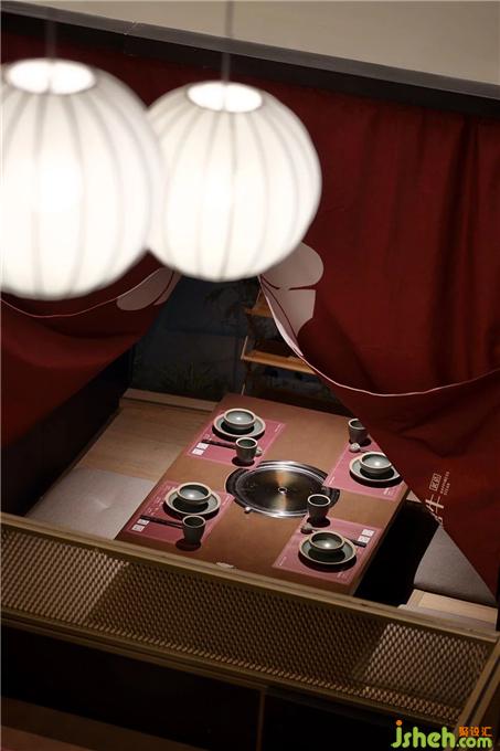 纯色暖帘轻轻飘动,日式酒具成队排列,温润的竹子阵列环绕,还有墙上的日式插画,点亮空间的竹编灯笼等;