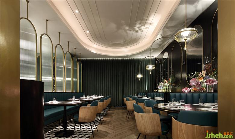 镜面的使用呼应空间,天鹅绒窗帘看上去格调满满,错位屏风赋予空间神秘感和私密性。餐厅设计