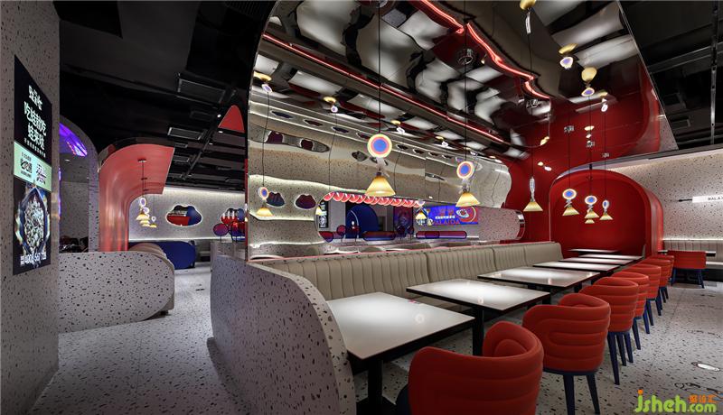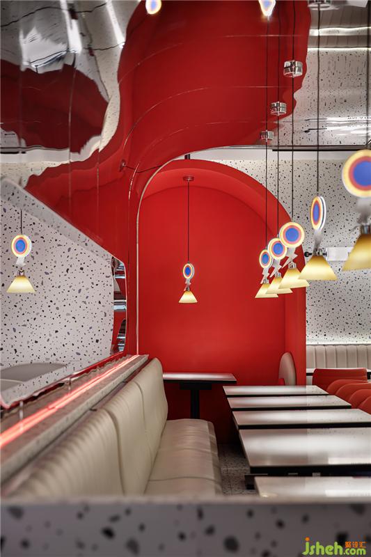 特别鲜明的镜面反射区隔,分割不同的情绪空间,镜面反射出迷幻色彩。一个乌托邦式的餐饮空间呼之欲出。