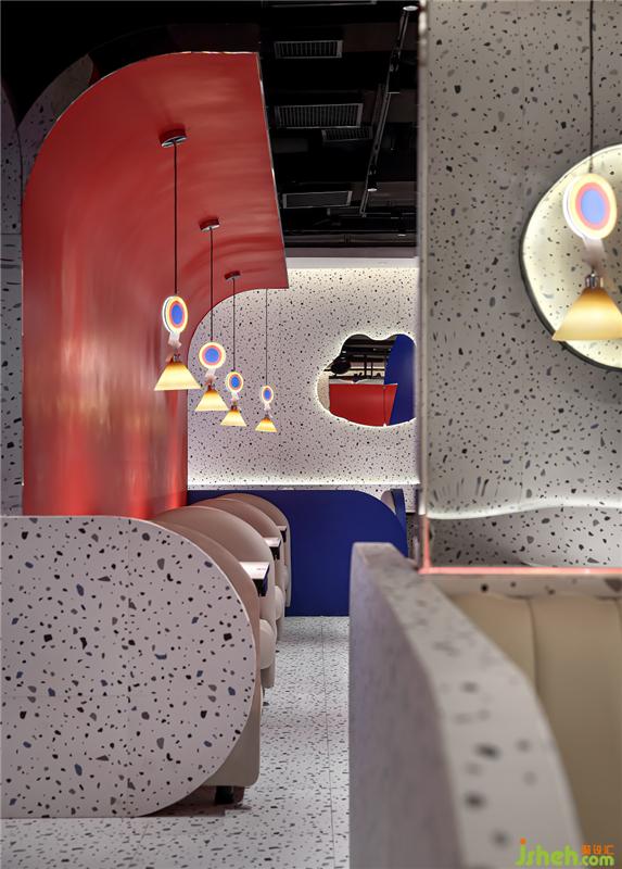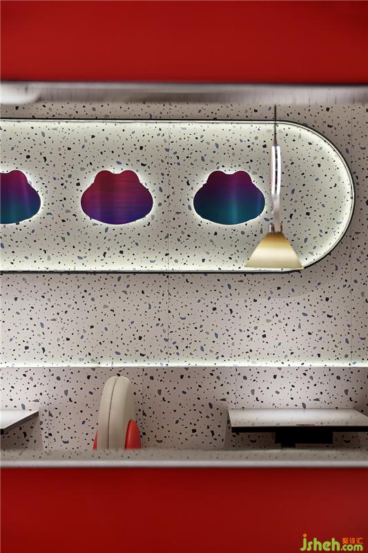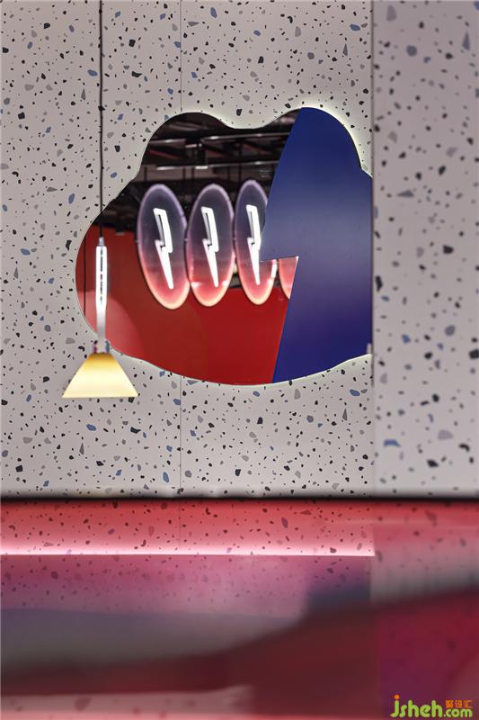 红与蓝,奔放和感性,有如世界的繁芜和简单,投射出复杂多变的情感。在本案餐厅设计中,墙面与地面运用了大量复杂的不规则图样来代表繁杂的世界、繁杂的情绪。