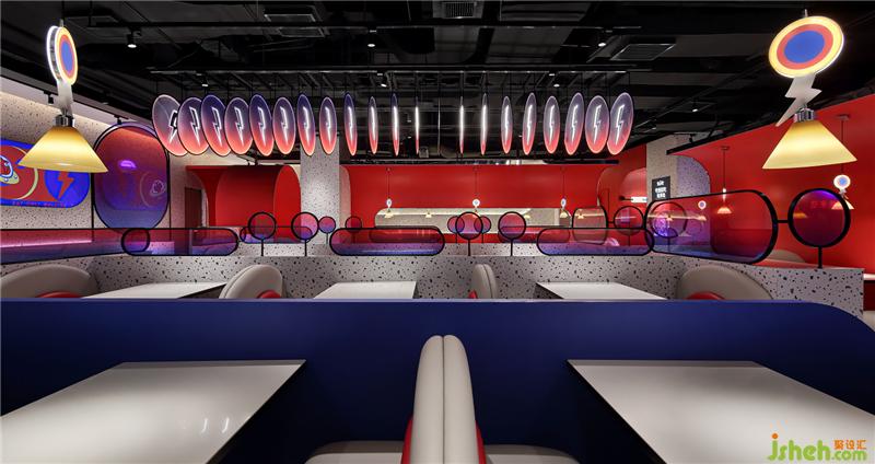 本案餐厅设计,品牌和空间相辅相成,高度统一。元素应用上,为突出使品牌的独特性,设计师将蛙来哒的logo解构,使蛙成为空间的主要轮廓,以空间呼应时间,用色彩营造情绪。
