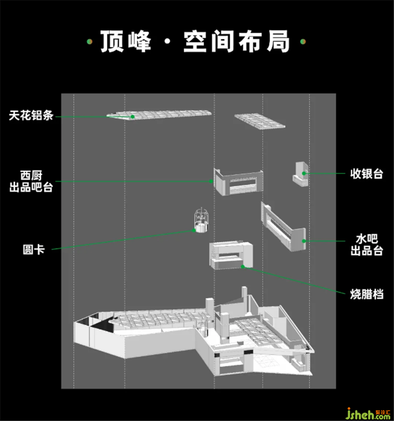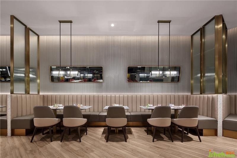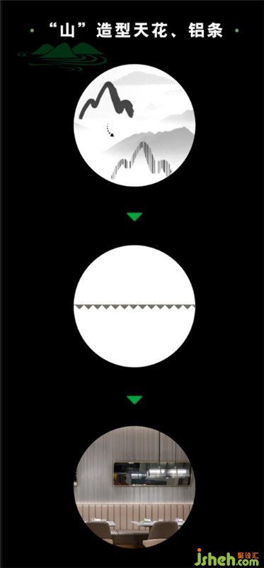本案餐厅设计以“山”为原型,撷取“山”不同角度的形为元素应用,打造出一个精致、时尚、简约、摩登的港式茶餐厅风格。