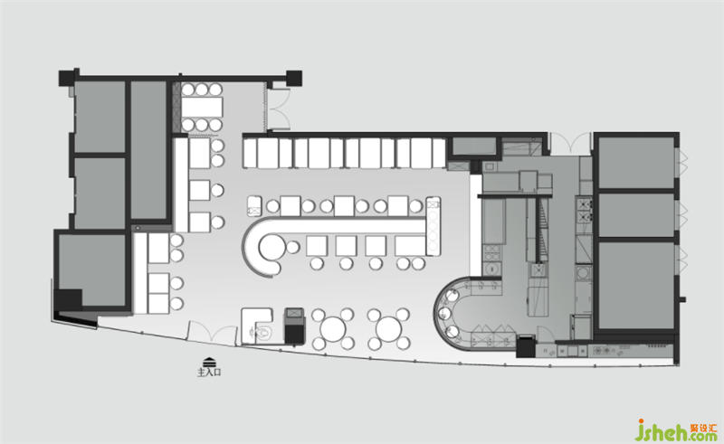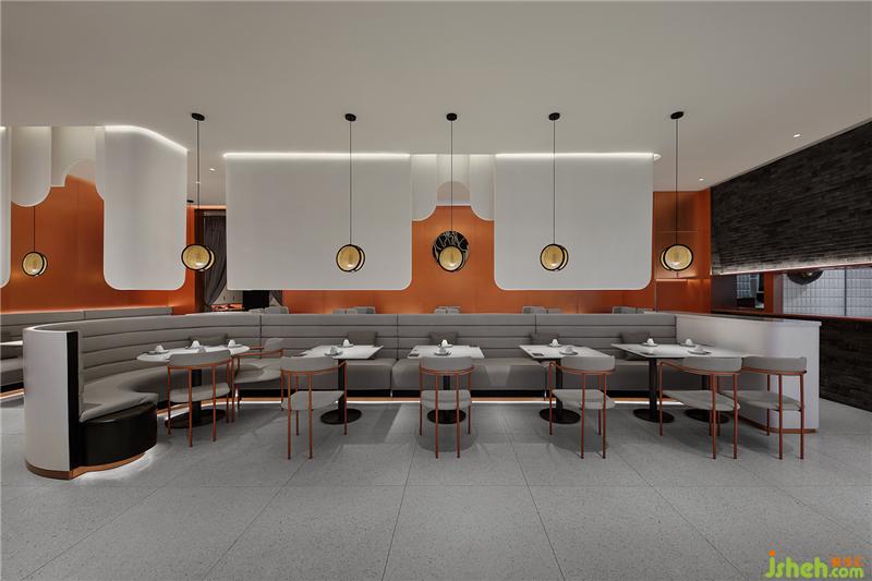 项目用材:烧制青砖、橙色不锈钢、白色烤漆钢板、水磨石地砖