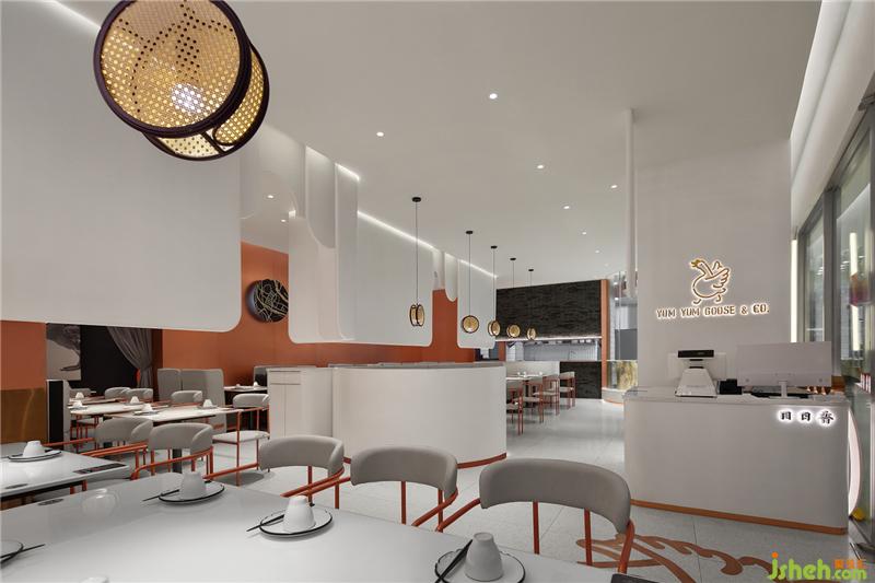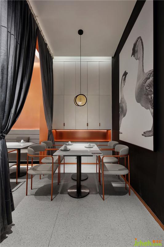右侧,半圆明档的掉鹅留存了卤鹅店经典印象。青砖排布的明档让餐厅设计带上一丝复古气息,不仅让传统材料焕发出现代艺术感,也让顾客切身感受到餐厅对传统卤鹅文化的关照。