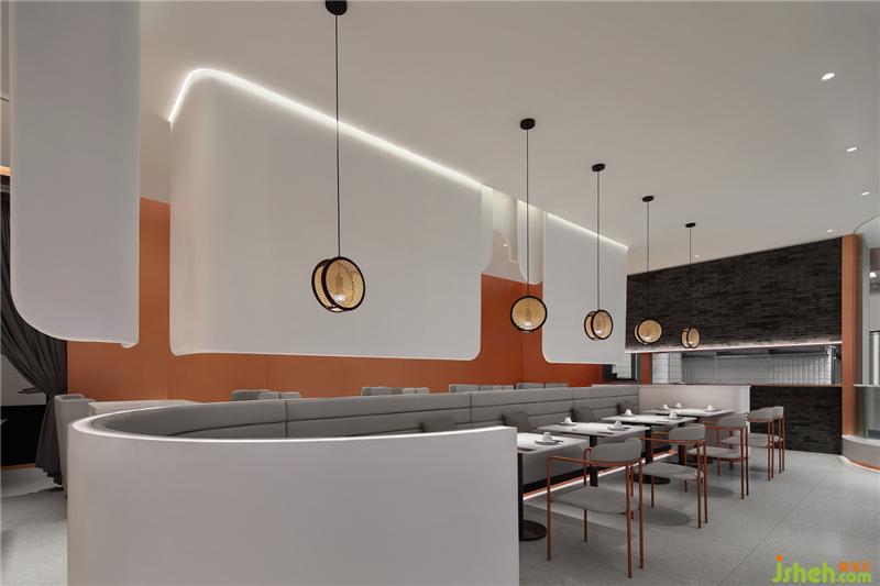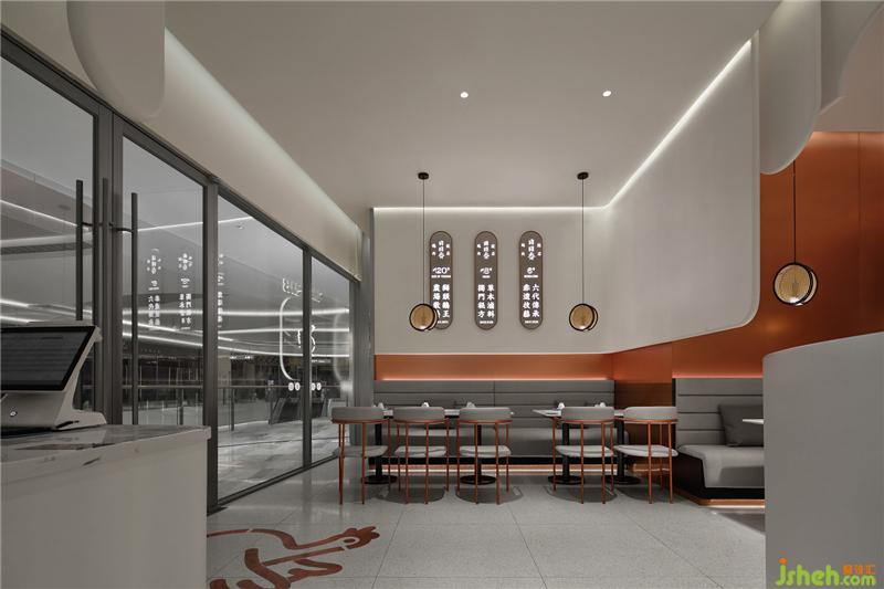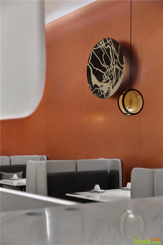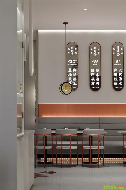 墙上长椭圆形展示卤鹅菜品,让日日香品牌文化融入空间。纯色沙发,极简桌椅,编织灯笼,鹅造型logo和鹅照片遥相呼应,强化品牌记忆,抢占客户心智。