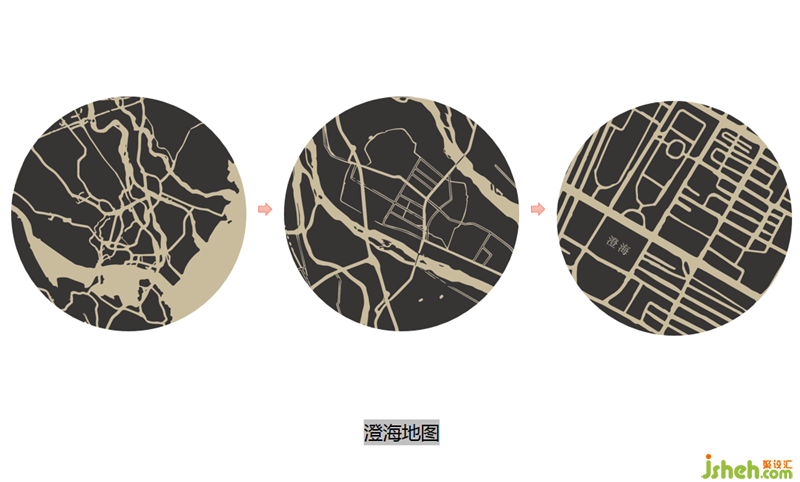此外在橙色背景上还有三幅地图,标识出潮汕澄海的地理位置。设计师用餐盘和地图结合的方式,表达日日香鹅肉美食发源地,强调了日日香鹅肉饭店的正宗本味,三幅地图逐步聚焦,又如美食在味蕾有节奏地牵引。