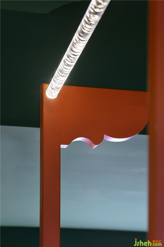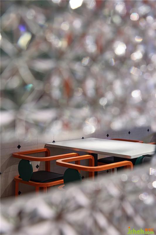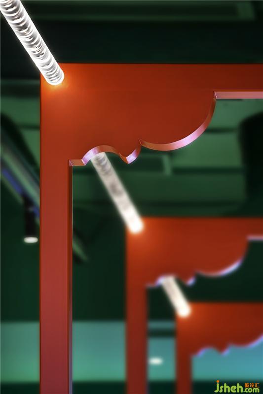 传统的雀替符号恍如村寨重现,现代亚力克气泡棒将其一一串联,营造出一种村寨迎接远方来客的感觉。传统元素和现代材质相融,也足见设计师对炭舍品牌文化的把控和细节考量。
