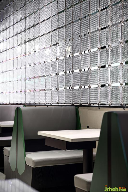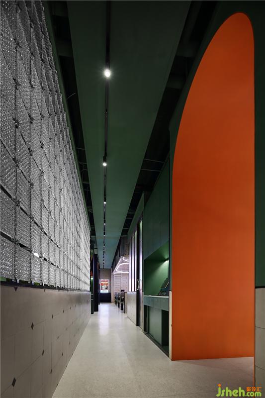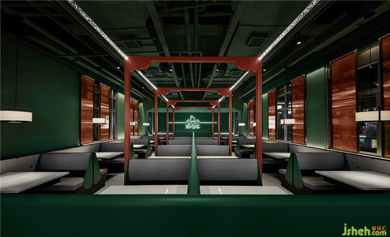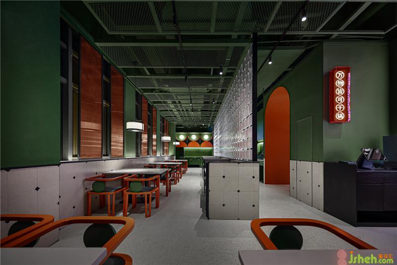 改造之前的集装箱位置比较矮小,设计改用水纹不锈钢来漫反射,从视觉上着手,拉伸空间,消减压抑感。藤椒绿墙上“小火人”活泼好逗,不仅强化着炭舍的品牌特色(十六中酱料秘制· 欢辣过瘾 · 因欢辣而欢聚),也调剂着顾客们的情绪,让用餐氛围变得轻松愉悦。
