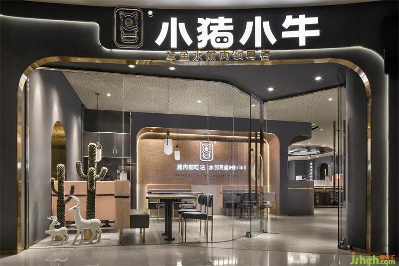 又从小猪小牛VI中提取颜色—— “灰蓝+肉粉”,聚拢品牌形象,强化视觉效果。随性放松、温馨亲民、热闹小聚,一个现代轻工风格餐厅就此诞生。