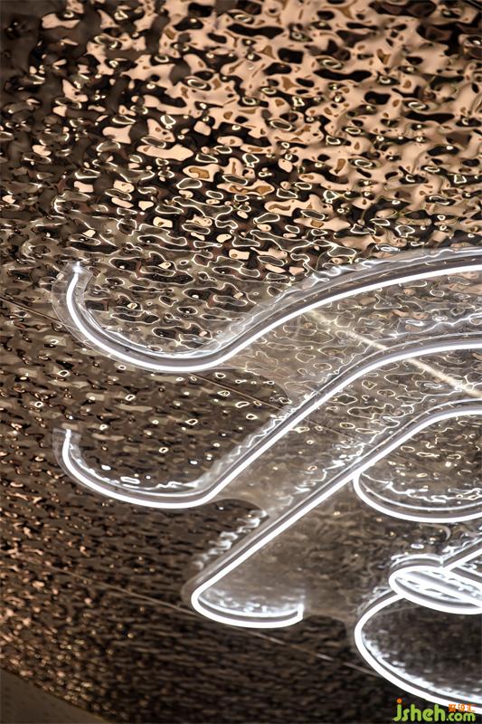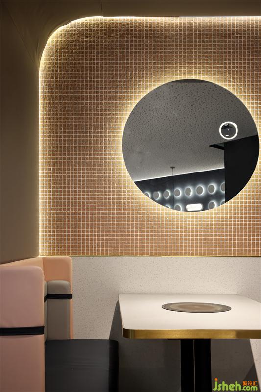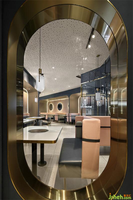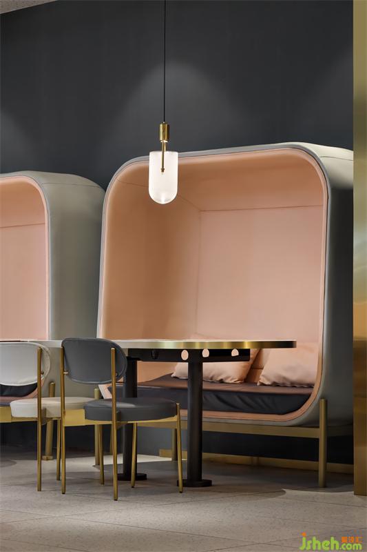 蓝灰色装饰墙面和弧角造型抢眼,涂料柔性协调金属的刚硬,一刚一柔,质感而不失温馨。卡座区给人一种乘坐潜艇出海的感觉,透过圆形“潜望镜”窥探海洋世界的一角。