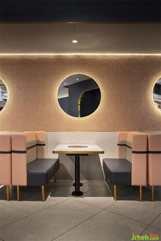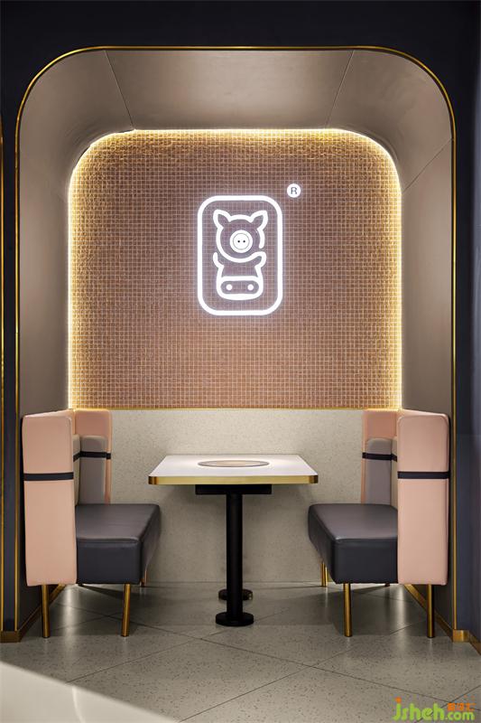 餐厅整体氛围轻松有趣、喜感温馨。提取自logo的猪鼻子、牛鼻子造型,阵列排序,既强化小猪小牛的品牌印记,也是和顾客趣味互动的一种方式。