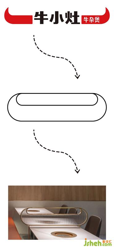 门头是空间视觉的第一记忆点大牛角符号形象生动也能令人产生“大牛角=牛小灶”的自然联想进而让牛小灶品牌文化在人们印象中巧妙嫁接强化视觉锤的表现力 本案室内设计以牛角元素为核心大大小小的牛角符号在空间布局里有计划有策略地陈列一步步深化品牌印象