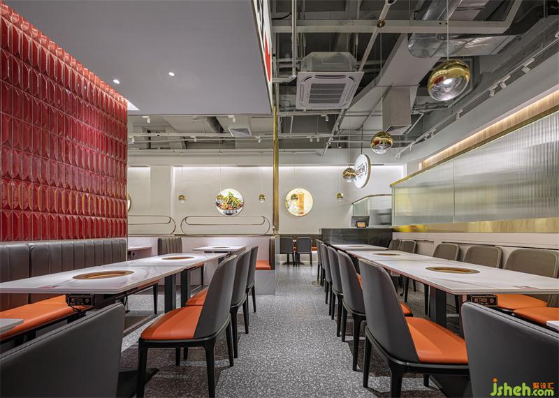 “广州牛杂煲,就吃牛小灶” 本案「牛小灶」空间设计经过我们分析论证围绕简约干净的基调开展设计师从牛小灶logo中拆解品牌超级符号“红色大牛角”解构重组、转化应用在空间中营造简洁干净、质朴自然的牛气空间