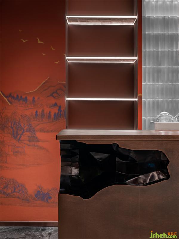 假山和沙石配制出枯山水意蕴,朦胧的玻璃砖墙为背景映衬绿植之灵,山与水,红与绿,枯与瘦,明与暗,会所设计师撷取人们熟稔的青绿山水画的一角融入会所,赋予空间情与景相融、出入画中的气韵。