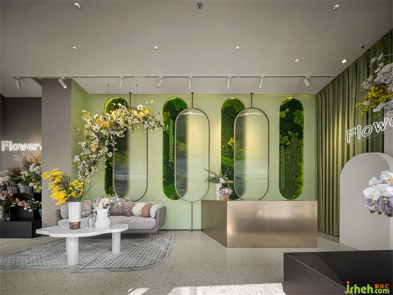 素雅的室內佈局為花卉搭建出展示舞臺,壁上框景展示草木之美,鏡面造景反射花容之姿,亞克力借景半遮半掩,洩露花卉若有似無的秘密。