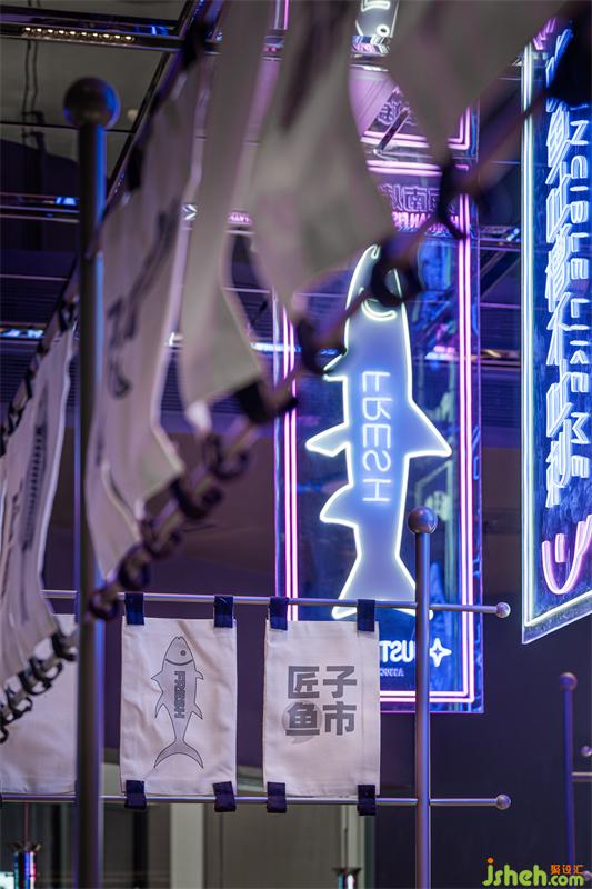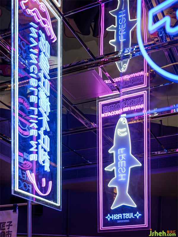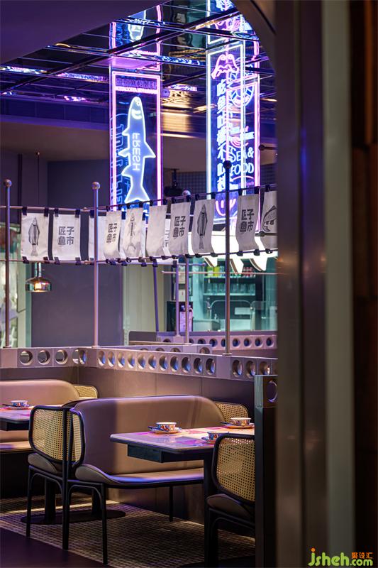 除烤鱼外,本案还有设有匠子小面,以满足顾客的多样化需求与空间的多功能使用。热闹的鱼市、解压吐槽大会、美味烤鱼新实践,「匠子烤鱼」率先将烤鱼和吐槽文化融合,营造令人眼前一亮的声光色场景。