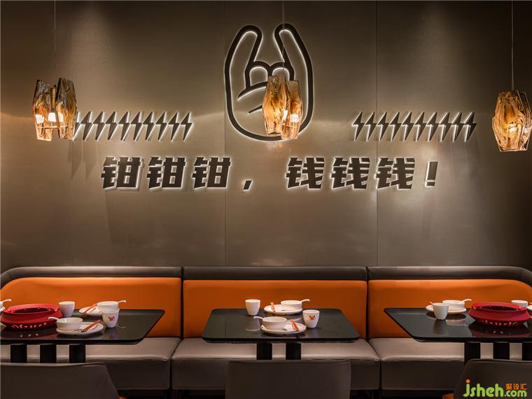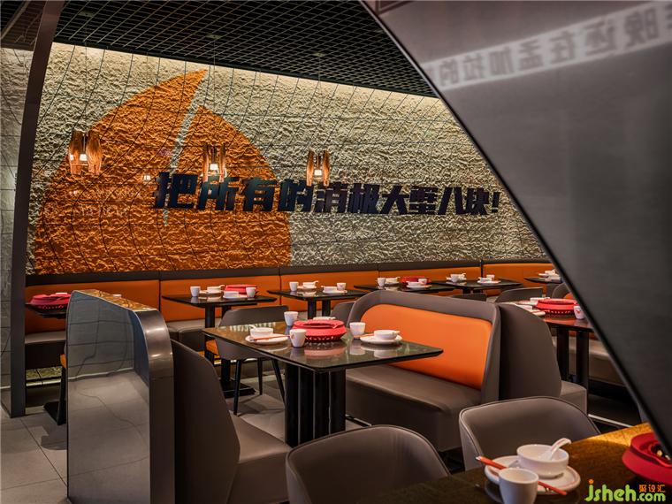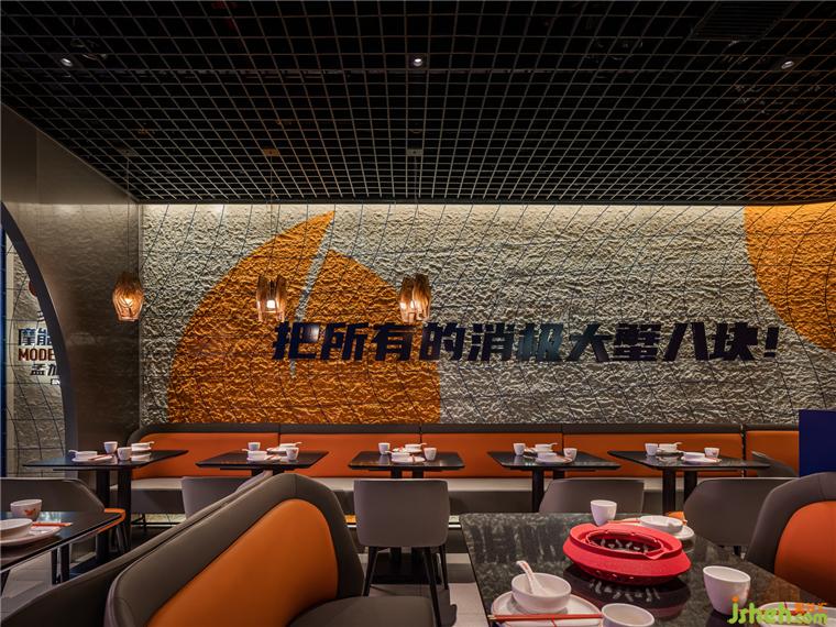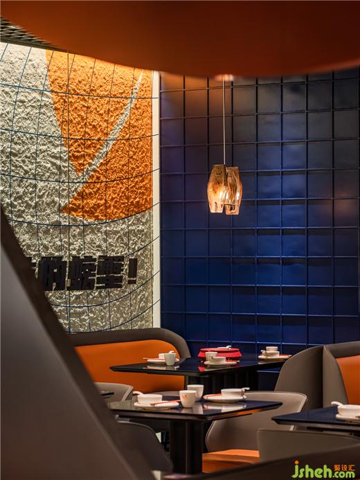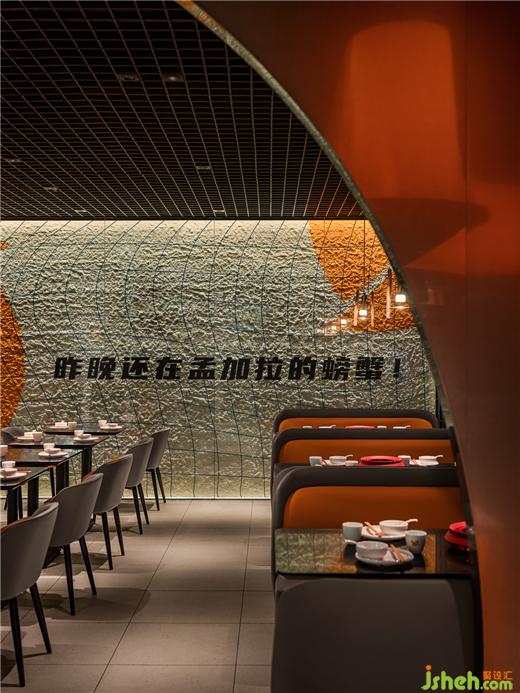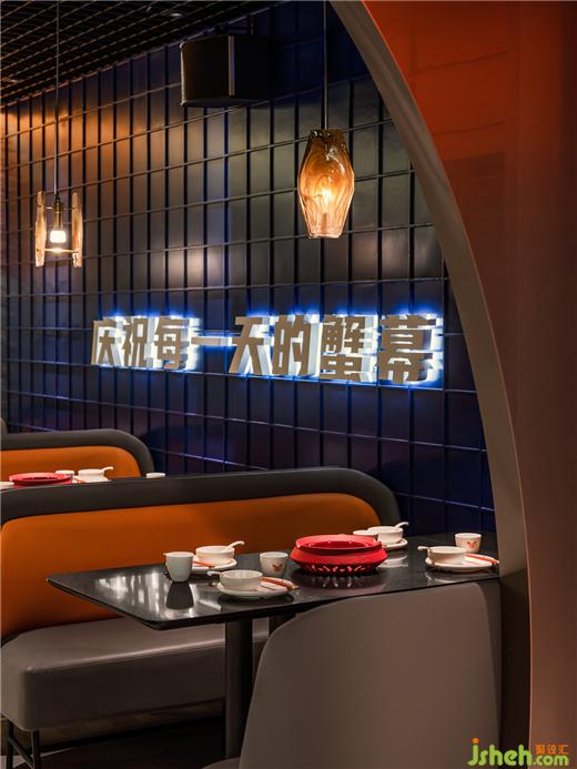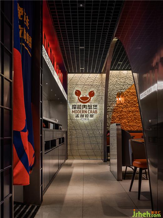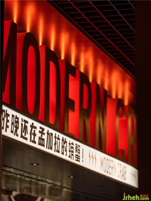 由弧形勾勒形成的客座就餐区,像是迷你版的圆形剧场,餐厅设计在空间中形成聚焦的舞台效果,隐喻“庆祝每一天的蟹幕”的互动主题,赋予了餐厅独特的性格,专属于摩能MODERN CRAB。