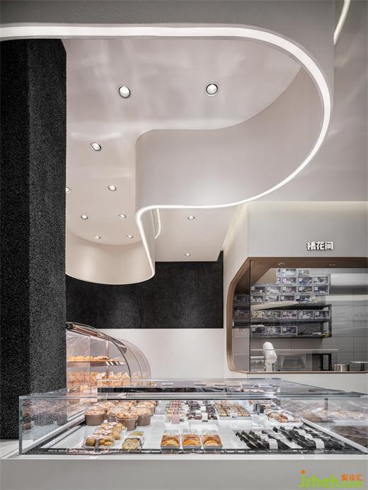 设计师希望用“动态的曲线”,对功能区域进行形式化。通过流线规划,优品颂面包房设计出一条顺畅的曲线服务动线,同时将烘焙区外设置座椅休息区,强化顾客与制作者之间的交流。