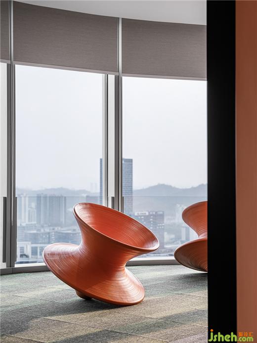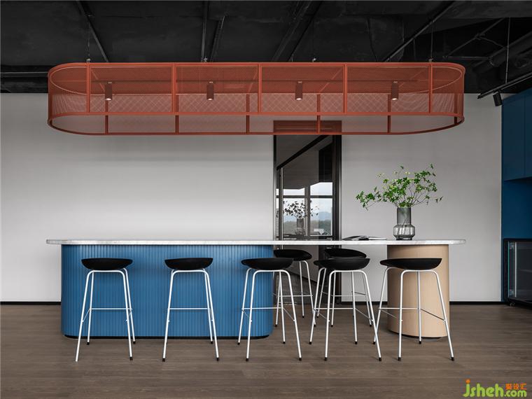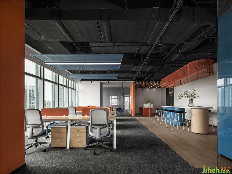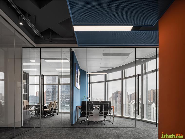 象征活泼积极的橙碰撞代表冷静澄澈的蓝,一张一弛,办公室装修设计涂抹出既张扬无拘又沉稳克制的场景性格,与ICT公司激情创造和理智缜密兼备的工作态度融洽无间。