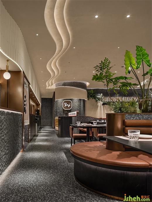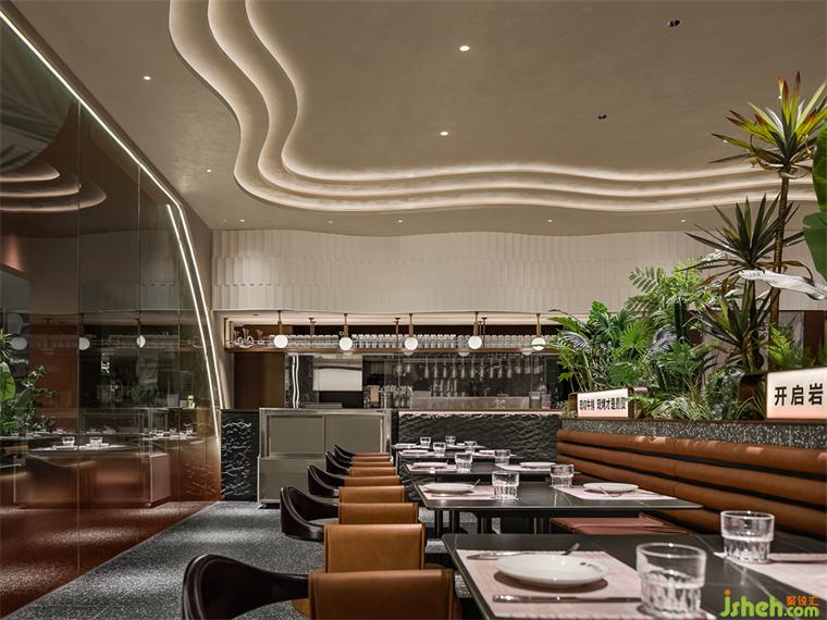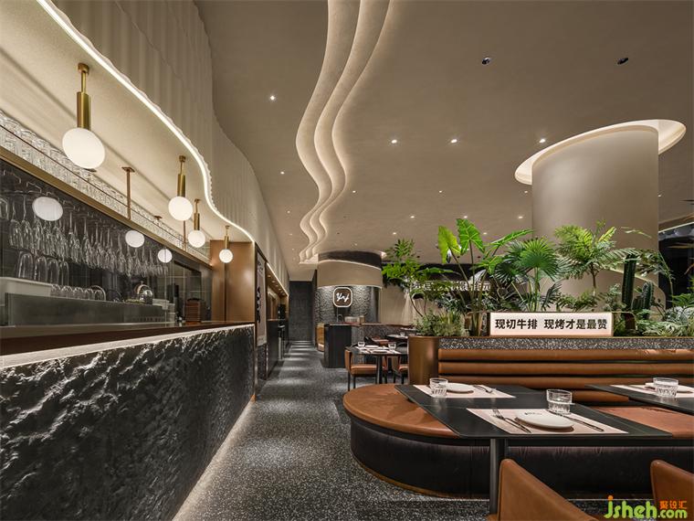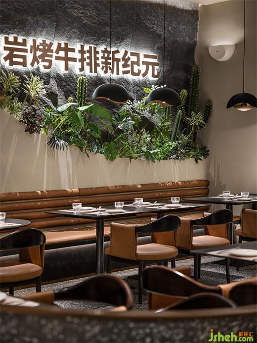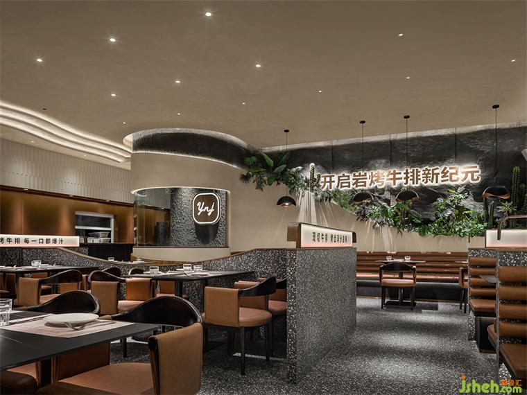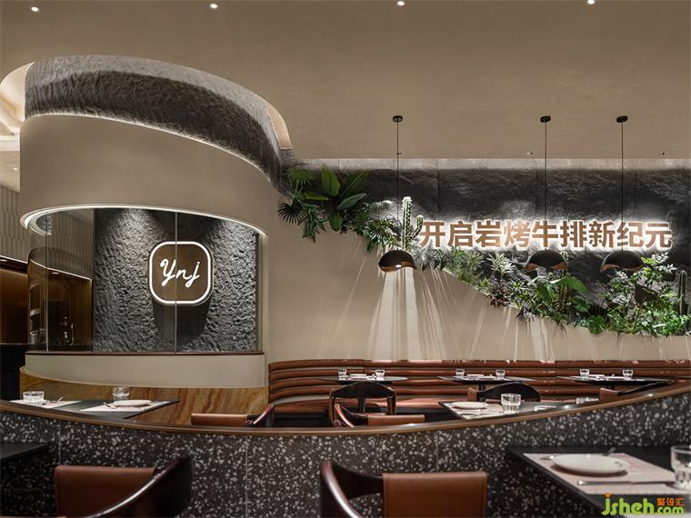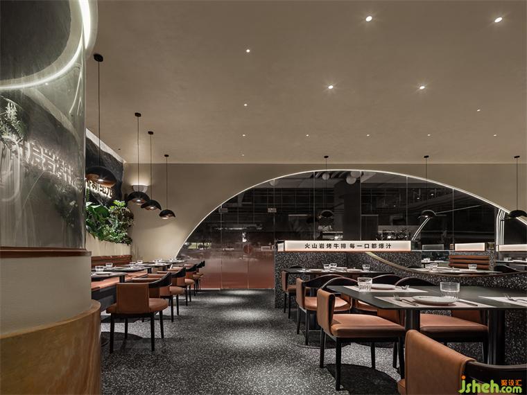 弧形曲面线条围绕半透明的烤扒房向外划出新月的边缘。餐厅设计轻质仿石的运用犹如地表裸露的岩石肌理纹路,直接展现岩质地貌的野性与粗犷。黯黑的岩壁之上,“开启岩烤牛排新纪元”的关键标语和品牌logo在强烈的色调对比下更显醒目。