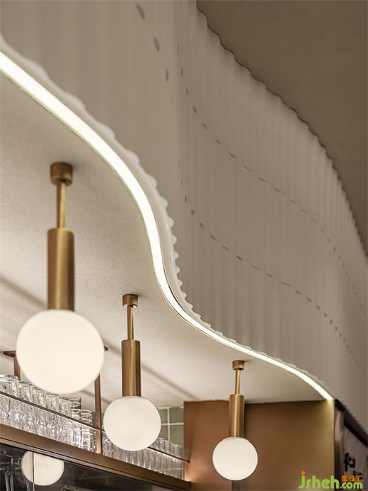 有序衔接的长波浪板,模拟纵横的沙壑演绎流沙律动,弱化方正格局的棱角感。顶部星罗棋布的小型点光源,在苍穹旷野间开辟出一片璀璨星空。