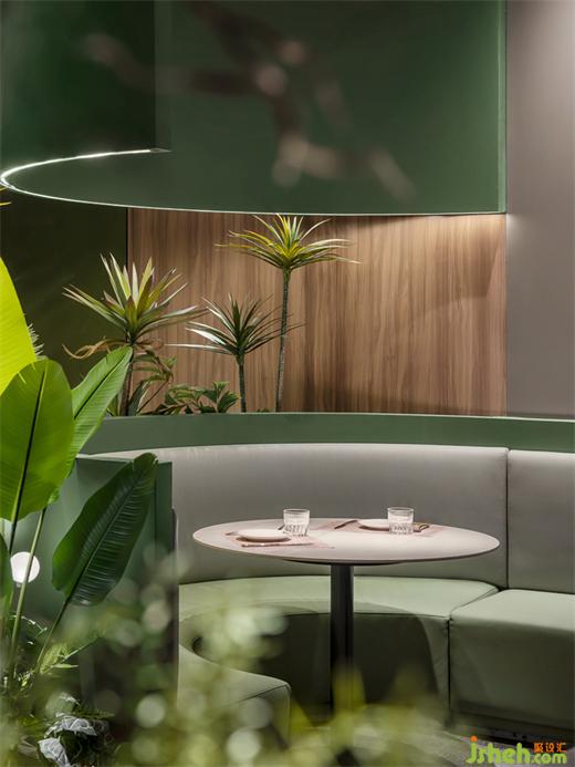 踱步进入森林,探寻自然的奥秘。对外是橱窗般绝佳展示位的观景台,向内则围合成半圆的小型卡座,一景两用,精致且淡雅。简练的天花铺装线条从就餐区向水吧延展,产生明确的交汇与秩序。