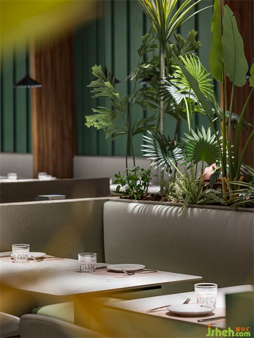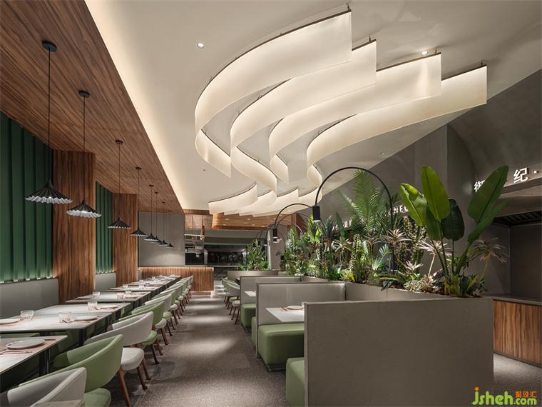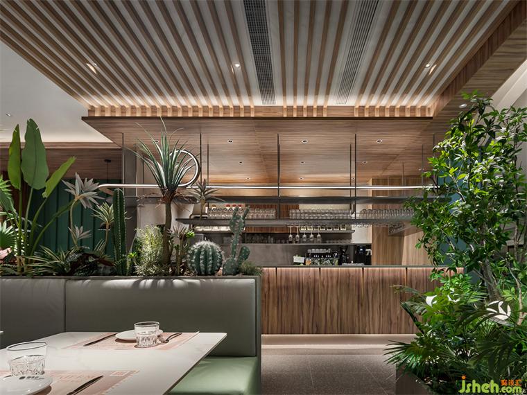 邂逅一片原始森林,迎接仪式感的开端。牛排餐厅设计简单开阔的门头构造、木质纹理与绿景的完美视觉集合率先定下森系而诗意的主要基调。墨绿色曲面中空观景小露台、清新绿植带呼应空间主题,酝酿轻松自在的氛围。