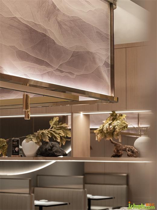 原木色沉稳的质感配以香槟金,传达着大渔摩登轻奢的调性。吊楣纹理如缥缈云雾涌动,亦似海水泛起的汹涌波涛,蕴藏自然界随性无规则的灵动美感。铁板烧设计瑰色映衬出大海平静的一面,在暖色灯光烘托下更显柔和。翻涌的涛纹、优雅的瑰色一动一静,展现大海瞬变的样貌。