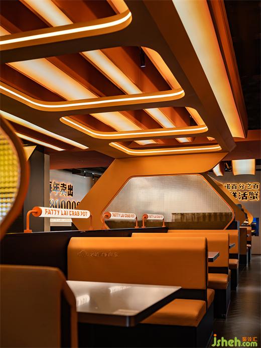 天花与地面始终保持统一的深灰色调,天地之际的黑暗与深邃涌动,藏匿其间的橙红色世界得以显现。餐厅设计纵伸或围合,纯白或渐变,线条和流光在空间里交织成多彩的太空景象。