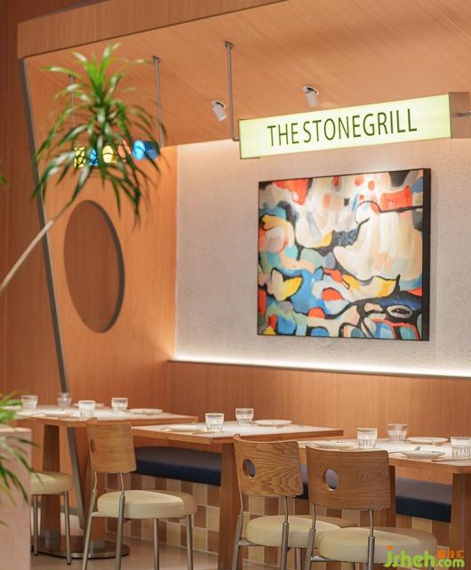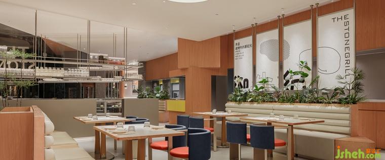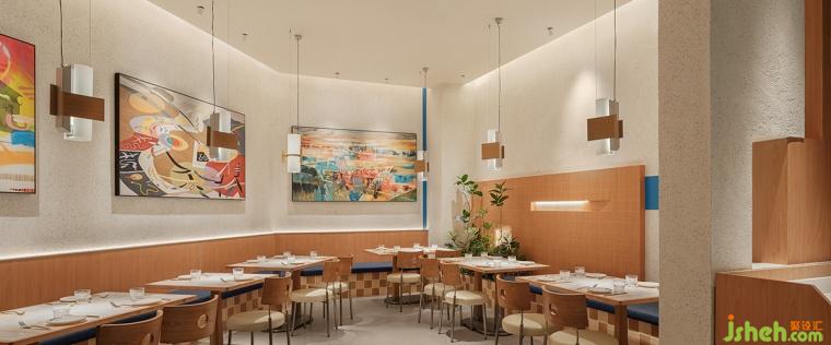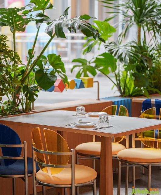 分区运用凹凸构成、错落叠级的手法,清晰突显功能,过渡连接三大就餐区,呈现多元的空间效果。体块与几何的结构、色彩与材质的穿插,就像蒙德里安格子画的抽象形式,在规整的秩序中展现自由随性的跳跃感。