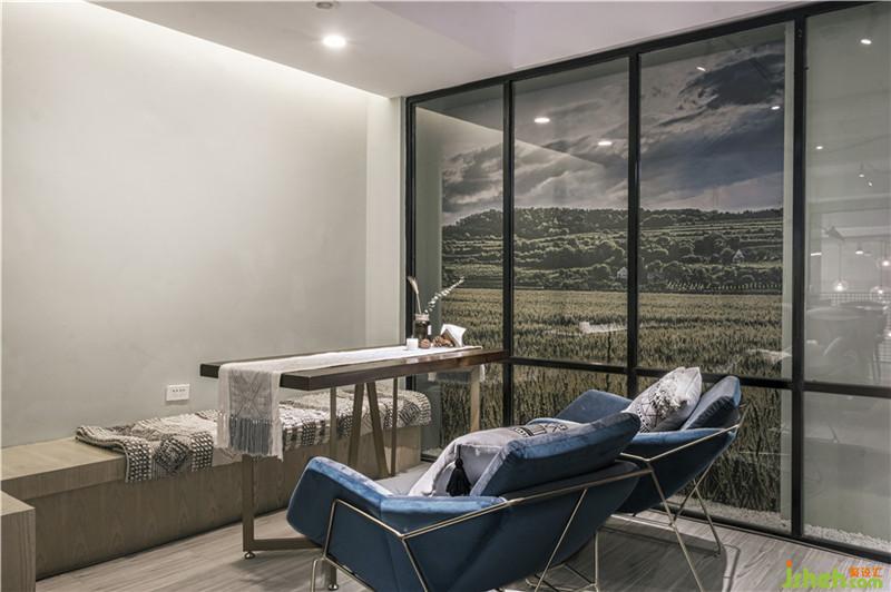 二层作为休息就餐区,简单个性的蓝色、灰色棉质沙发慵懒闲适。同时沙发窗边的人造麦田风景,为内部空间增添一丝静谧,也更贴近自然,让顾客能在此处尽享安逸和放空。
