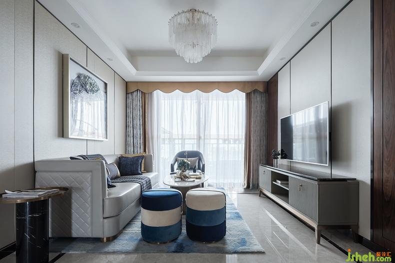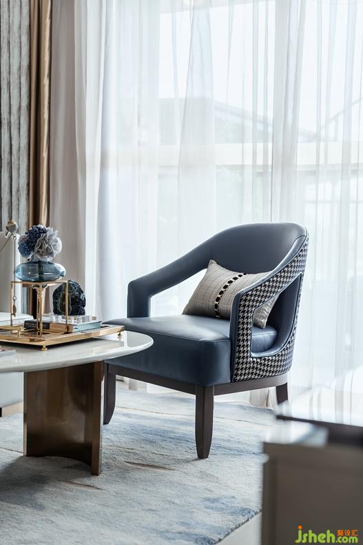 客厅选用素米色的极简丝质背景墙,茶几上雅士水波纹理石饰面来定义空间的清雅柔和,清雅的湖水蓝与格纹搭毯轻轻地挑起空间的韵律美感,搭配蓝黄花艺,空间附着着一层恰到好处、不过于浓郁的浪漫情调。阳光透散过微透的纱帘为空间染上一抹暖意,令人们不觉沉溺于韶华中的闲适与安缓。