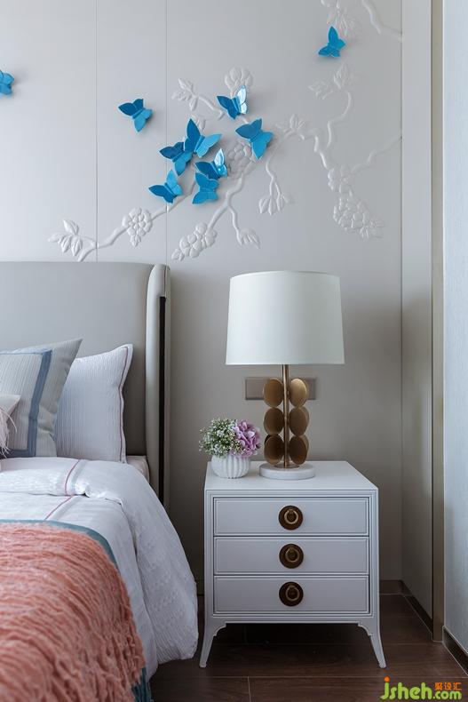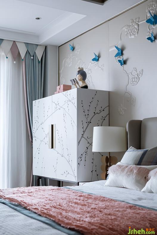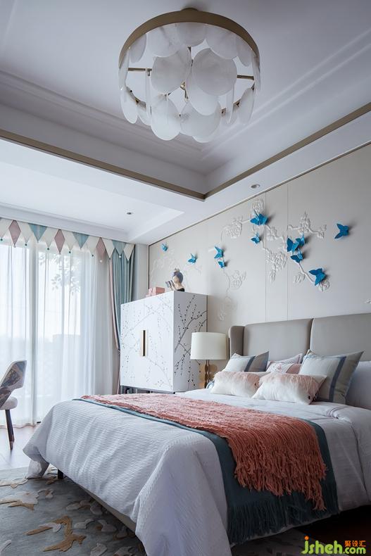 别出心裁,是为另辟风景。此处卧室,则俏皮许多,设计上,更为大胆的色调提升了简约时尚的气质。珊瑚粉与淡青、天蓝形成对比,然低饱和度的调配,令彼此相称,毫不突兀。加上蝴蝶、花鸟点缀,以青春气息,演奏着成长的音符,培养东方性情中的谦虚、宁静。