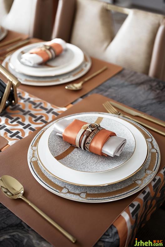 纵跃大开间的客餐厅拥有客观的尺度感,爱马仕橙色及金色配饰,则瞬间让整个氛围活跃起来。设计发挥空间优势,通过合理而巧妙的手法划分功能区间,结合精致得体的配饰,让明媚的阳光得以在空间里随意跳跃,自由翩跹流淌,为居者提供体贴舒适的居家时光。