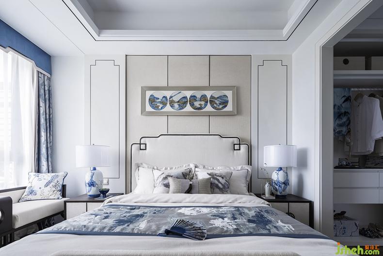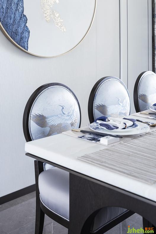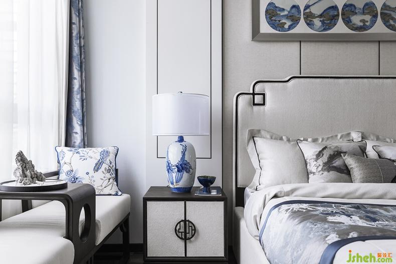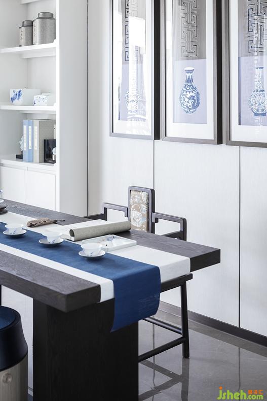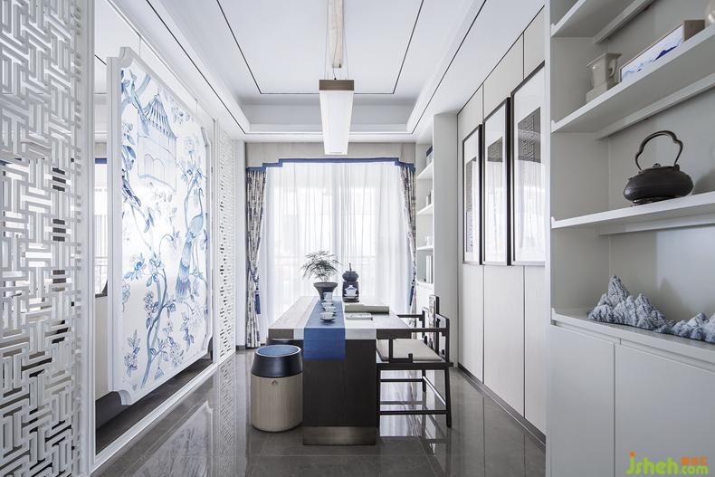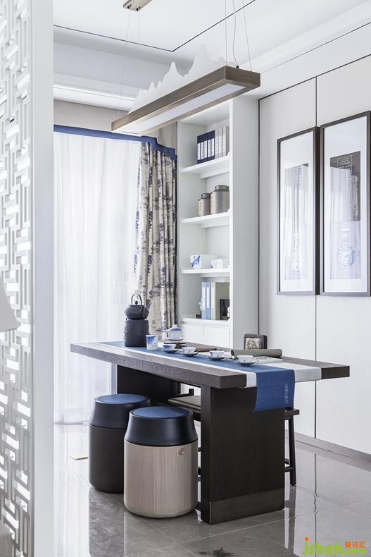 书房里同样秉承了大厅蓝白色系,青花之美无不显露,高贵素雅的青白搭配呼之欲出与客厅遥相呼应。书房的设计渲染着浓厚的书香气息,现代中式的简洁设计元素在其中,使空间更大气舒适。
